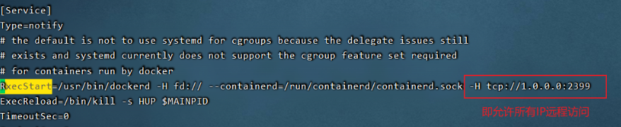 2、找到ExecStart,在最后面添加 -H tcp://0.0.0.0:2375